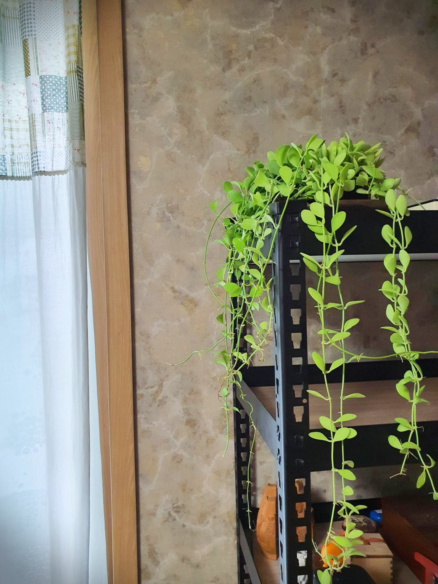 철사를 잘라내면 걸수가 없는데 (행잉 플랜트인데 걸 수가 없다고.. ) 일단 철사는 다 빼주고 너무 치렁치렁한 친구들을 정리해서 물꽃이 해주고 집에 화분 밭침으로 쓰던 도자기 접시에 담아 책선반 위에 올려 행잉 느낌을 주었다.