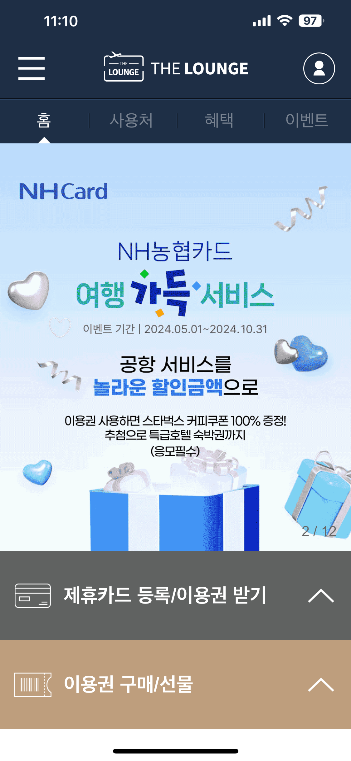 아무튼, '더 라운지' 앱을 다운 받고, 내 신용카드 (신한카드) 를 등록하니까 쿠폰을 무제한으로 다운 받을 수 있었다.